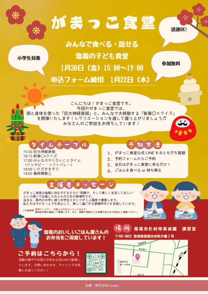 2026年01月30日(金)にみんなで食べる・話せるをコンセプトとした子ども食堂「がまっこ食堂」を開催いたしました。今回は「巨大神経衰弱」と「新春〇×クイズ」を行いました。60名の方に参加いただき、スタッフ共々楽しい時間を過ごしました。